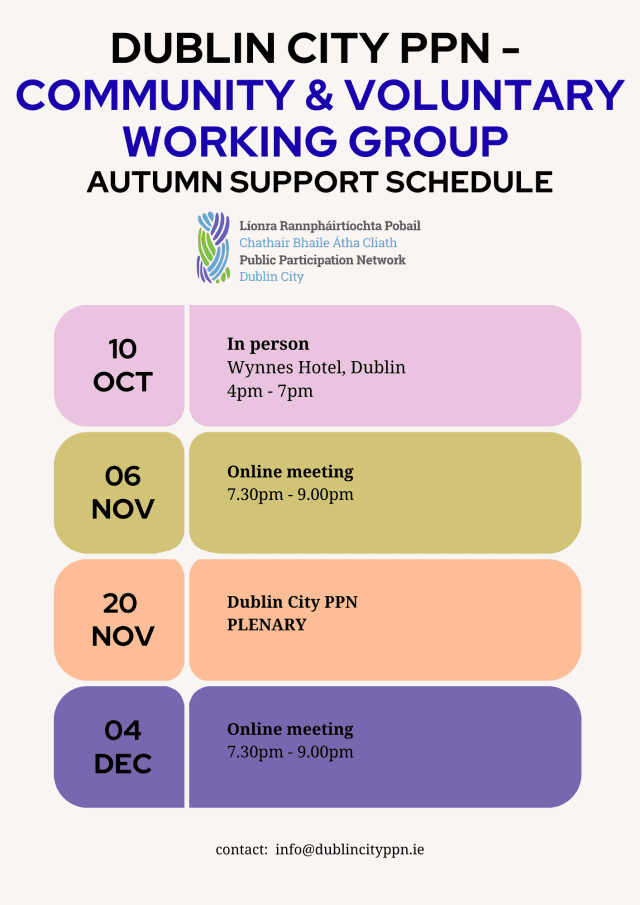 Members of the Social Inclusion pillar working group are invited to a series of support sessions with Ellenora Lynch. These sessions aim to support PPN Representatives in their committee work …